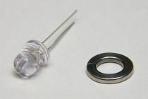 | 直径8mmのツバ付きLEDと、それに合うM8ネジ用のスプリングワッシャ。懐中電灯に収めることを考慮し、外径が14~15mmのものがベストだ。またワッシャはあらかじめペンチなどでひねって、スプリングを平らにしてしまう | スプリングワッシャをこのように通して、クリプトン球のツバに当たる部分を作る |