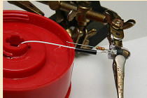 | 電球部分の出っ張りには、UNIの「ゲルインクボールペン」のリフィル(替え芯)のケースを使ってみた | 12mm程度に切って、クリプトン球と同じ大きさになるように長さを詰めていく | 電池のプラス側につなぐ、長い足を切断したケースに通す |