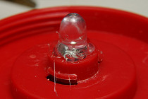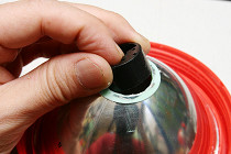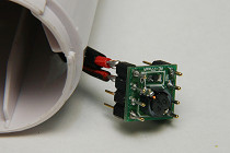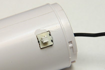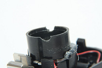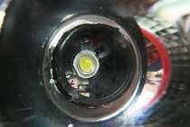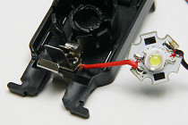 | 豆電球ソケットの穴は小さいため、そのままではパワーLEDは上手く固定できない。ソケットの一部を削るなり、ニッパーで切断するなどで、安定して置けるよう加工する | LEDを固定したところ。この加工は懐中電灯によって変わるので、各自でアレコレ工夫して欲しい | |
