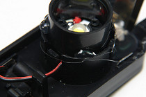 仮組みをしながら、LEDの取り付け位置を調整し、ホットボンドなどでLEDのホルダを固定する。なおLEDとLEDホルダーはめ込むだけで固定できるようになっている。このとき、ホルダーにはめるレンズ(後述)は、まだ付けずにおく。