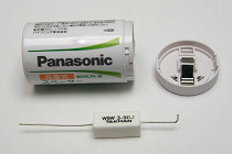 乾電池スペーサーの加工方法は、まずマイナス側にセメント抵抗を半田付けする。次にセメント抵抗の反対側の足をスペーサーのプラス端子の穴に通して、マイナス側のフタを閉じる。最後にスペーサーのプラス端子とセメント抵抗の足を半田付けする。