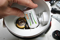 | リフレクターの台座は瞬間接着剤などで固定 | LEDにリフレクターとレンズをはめ込めば完成 | 元々が単三→単一のスペーサーなので、電源は単三型だ |