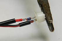 | 定電流ダイオードに電線を半田付けする | 電池をセットするスペーサー本体には、DC/DCコンバータを取り付ける穴とスイッチをつける穴、そして電線を通す穴を開ける | |