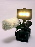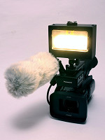 | 筆者がHDカム用に作ったビデオライト。もちろん現役で活躍中! 確か1万円もかかってない、いや5千円以下で作ったように記憶している。ディフューザ(拡散させるフィルタ)を使うと影も薄くなる | |