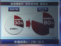また加湿機ですが、これまでは冬場限定の製品と言われてきました。しかし、夏場はエアコンを付けていることから、乾燥しやすい環境にあるため、デスク周りに加湿機を置きたいというニーズが増えています。加湿機や加湿空気清浄機も、年中製品になってきたという点は見逃せません。2010年度は空気清浄機のうち8割が加湿機能搭載の製品になると予想しています。こうした動きも、空気清浄機市場全体の拡大につながっています。