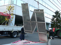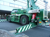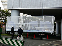 | クレーン車は午前8時過ぎに準備が完了 | 午前8時30分、撤去作業用のゴンドラをトラックから降ろす | 8時50分に作業に利用する工具などを屋上にクレーンで持ち上げる |