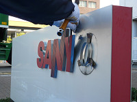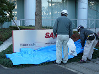| 本社入口の看板の作業の様子 | 三洋電機の文字がはがされていく | ロゴマークを取り外していく |