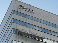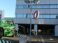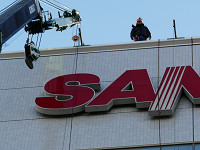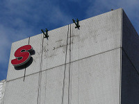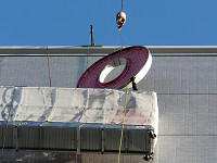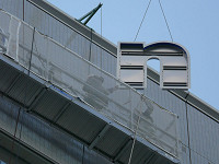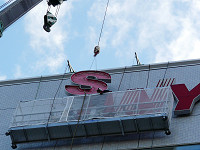 | 本社第二ビルの「S」だけが前日までの作業で残っており、これを25日午前に撤収 | 取り外された本社第二ビルのSの文字 | 本社第二ビルに設置されていたLEDサイン分電器も撤収した |