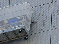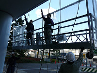 | ゴンドラを吊るすための固定作業の様子 | 屋上から準備が進んでいることが地上の作業者に対してサインで送られていた | 午前10時から作業用のゴンドラを上昇 |