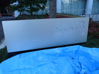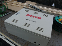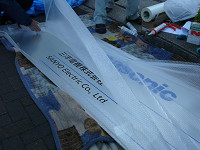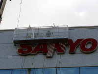 | 完全に取り外された状態 | この上に新たな看板を取り付けるため、油分などを除去 | 新たに取り付けられるパナソニックのロゴが入った三洋電機の看板 |