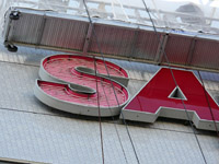 | 午前中に撤去されたロゴ | SANが撤去された状態 | ロゴを撤去したあとには電飾用の配線管が残る。午後の作業は「SAN」の文字のあとに残された電飾用の配管やボルトなどの撤去からはじまった |