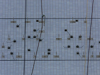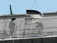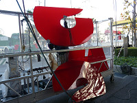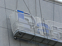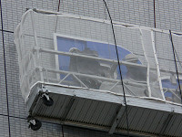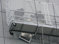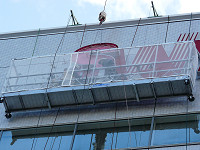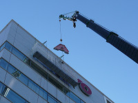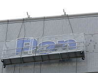 | 午後の作業では、先にカバー部をゴンドラに乗せた。これだと土台部を設置後、一度ゴンドラを降ろさなくて済む | 13時30分からゴンドラを上昇させようとしたが風が強く、一時作業を中断 | その後、風がやむのを待ったが午後5時にこの日の作業の中止を決定。残りの文字は、三洋電機の仕事納めを待って、12月29日以降に取り付けられることになる。風が強く文字を覆う作業もできず、Panの文字のまま、29日まで残る |