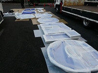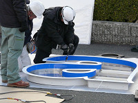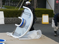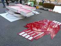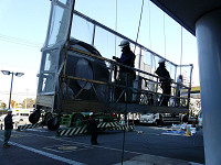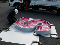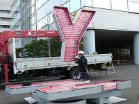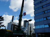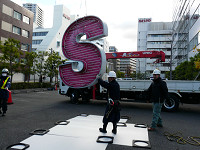 | 10時45分、クレーンで吊るされるSANYOの「S」 | 静かにSの文字が降ろされていく | 地上に降ろされたSの文字。降ろしてみるとかなり大きいのがわかる |