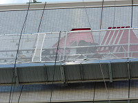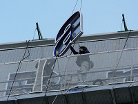 | ゴンドラが上昇していく。約5分をかけてゆっくり上昇 | 横からみると、ロゴが電飾用の配管やボルトで固定されているのがわかる | 10時13分からロゴの撤去作業がはじまった |