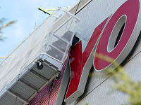 | 残された「YO」の文字。ゴンドラを吊る位置も移動させている | 15時からYの文字の撤去を開始する | 15時25分にYの文字が降ろされる |
