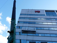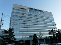 | 午前9時10分から、本社まわりの看板から三洋電機の文字がはがされる | ブルーの色は保護用のカバー | 名称は、三洋電機本社第一ビルから、三洋電機守口第1ビルに変わった |