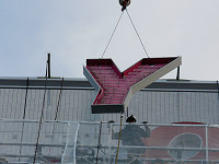| Nの文字が、SとAの文字の上に積み上げられる | 午前の作業はS、A、Nの3文字を撤去して終了。ゴンドラが降りてくる | ゴンドラには外枠が積み込まれていた |