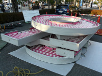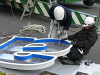 | 8時30分にはPの文字の取り付けを開始。まずは左側部分から設置を開始した | 8時45分にPの文字の右側部分の取り付けを開始 | |
